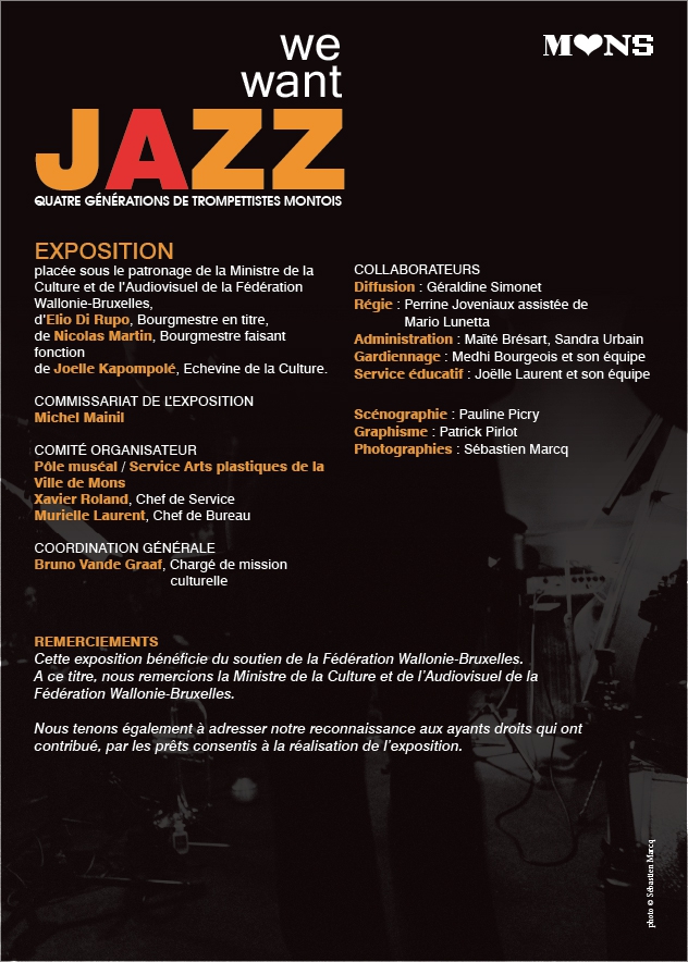 We want Jazz!, est une exposition organisée par le pôle muséal de la ville de Mons, qui met à l’honneur cinq trompettistes montois. Mission : Réalisation de l’habillage graphique de l’exposition.